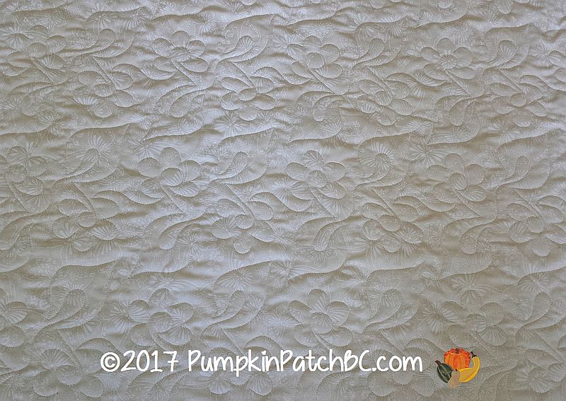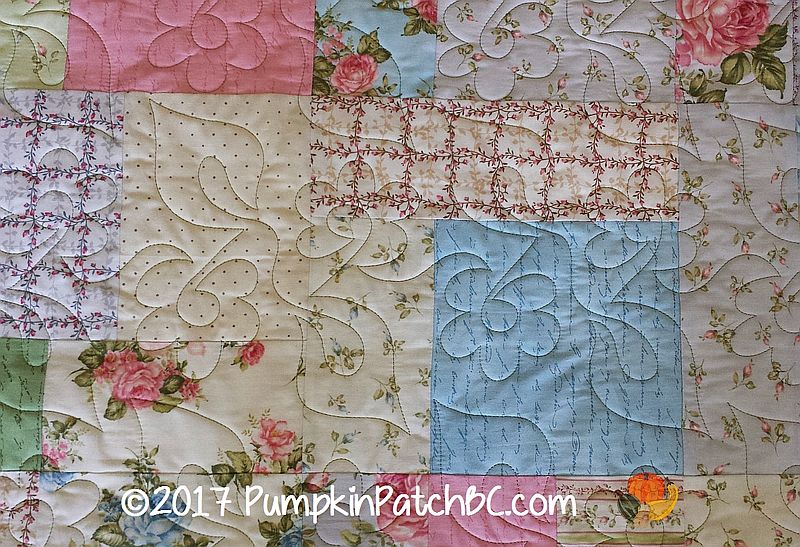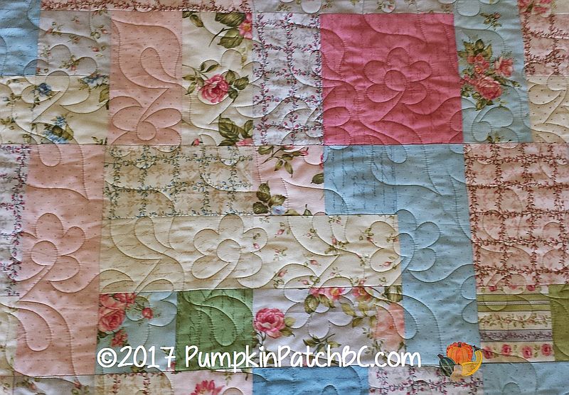 This beautiful quilt top was made by Pattie, I love the soft, feminine colours. Pattie was looking for a floral design, and we chose “Daisy Duo” for her project. I am always happy when customers choose a thread colour that doesn’t completely blend with the background and was delighted when Pattie went for “Willow”, a lovely light green, instead of cream or another neutral colour. It goes well with all the fabrics but makes the quilting stand out a little more.