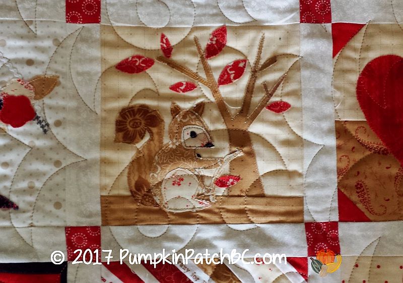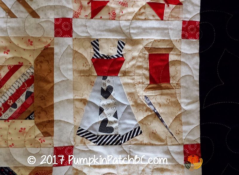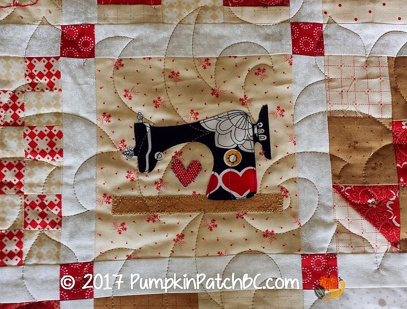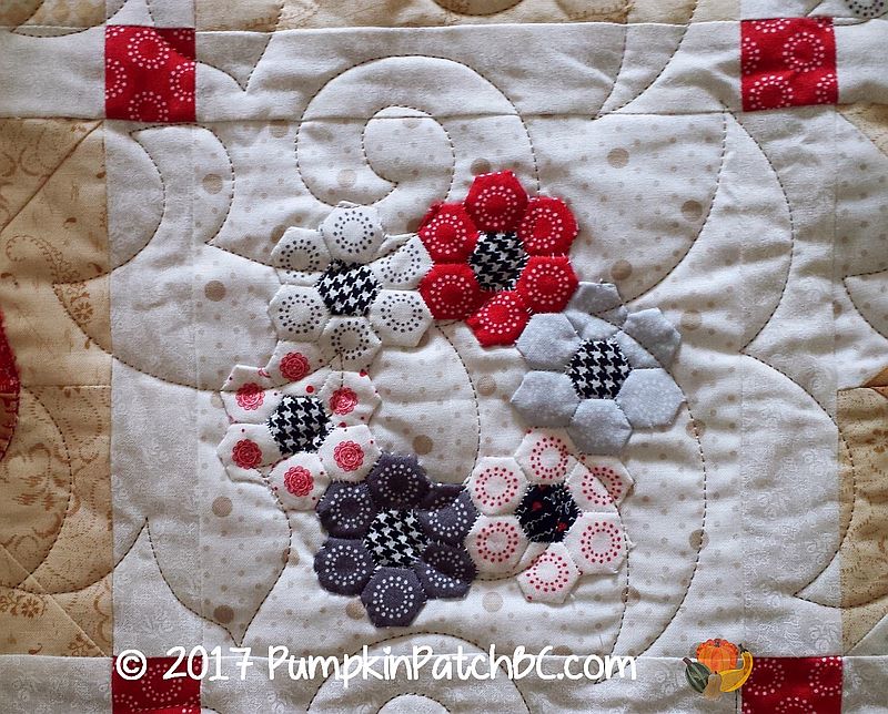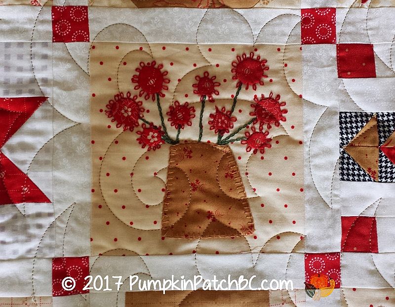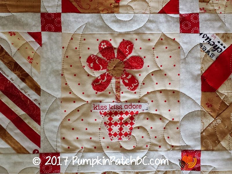 This adorable quilt called the “Splendid Sampler” was made by Lynne. It has a little bit of everything – piecing, appliqué, hexagons, embroidery. I took lots of pictures of all the cute blocks and had a hard time deciding which ones to post, so there will be quite a few today. The pantograph Lynne chose for her project is called “Fleur de Swirl”.
