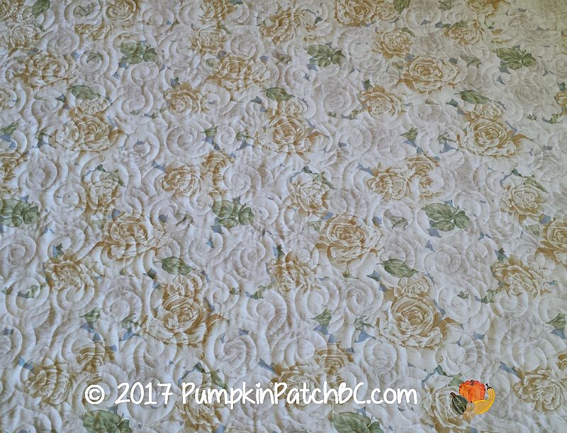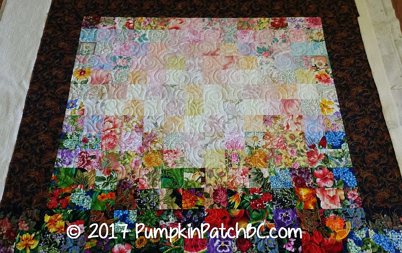 A watercolor quilt is one of the things in quilting that I have never tried. And now that I am spending the year getting rid of my 2″ squares I doubt that I will attempt this anytime soon. Sky asked me to quilt her watercolor quilt for her, and I really like how the flowers extend into the border, creating the illusion of flowers in front of a window. I quilted for Sky before, and she liked the pantograph we used for her other quilt and wondered if we could use it for this one as well. The design was “Turbulence”, and while I agreed that the swirls would look nice I didn’t think the scale was right for the smaller squares in this quilt. We decided to use “Jessie’s Swirls Simplified” instead which is similar to “Turbulence” but smaller and fits this quilt much better.