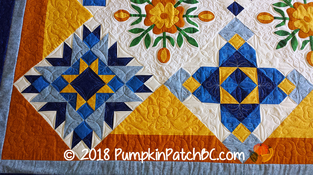 Diesen gelb-blauen Quilt hat Nora genäht. Die Rosenblöcke sind mit der Hand appliziert. Die gepatchten Blöcke sind alle unterschiedlich, haben aber ähnliche Elemente, und ich habe versucht, das mit den Quiltmustern aufzugreifen. Für die Setting Triangles habe ich die Rosen als Quiltmuster übernommen und den äußeren Rand mit einem Free-Motion Blumenmuster gequiltet. Ich mag Quilts, die Applikationen und Patchwork kombinieren, besonders gern, daher habe ich mich sehr gefreut, als Nora mich bat, diesen Quilt für sie zu quilten.