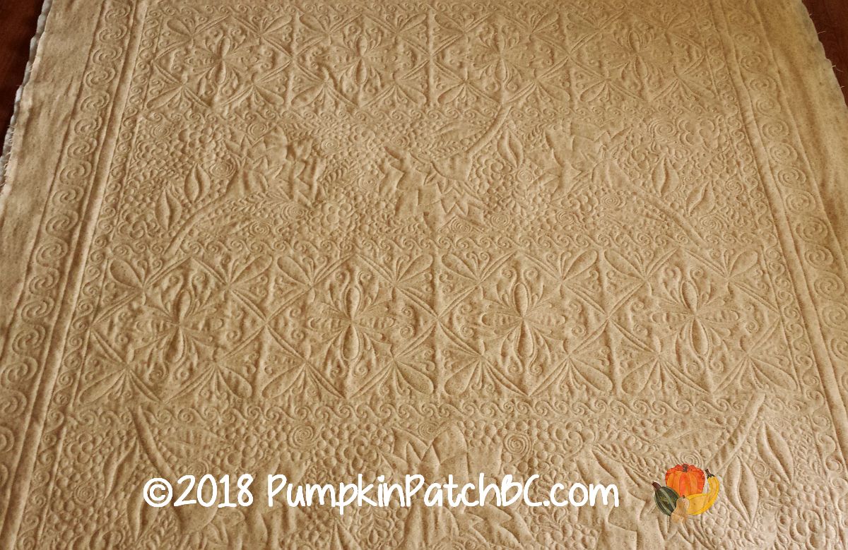 Diesen schönen Quilt hat Brenda genäht und dafür eine Anleitung der Quilt Patch Pattern Company verwendet. Für die Reihen im Schachbrettmuster habe ich mir ein Quiltmuster ausgedacht, das ich ohne Abzusetzen komplett quilten konnte. Das erfordert immer ein bisschen Planung, ist aber einfacher, als es sich anhört. Den Hintergrund um die Blumen herum habe ich mit verschiedenen Mustern gefüllt, die Blumen selbst habe ich nur wenig gequiltet, so dass sie sich schön plastisch hervorheben. Mit dem Endergebnis bin ich sehr zufrieden.