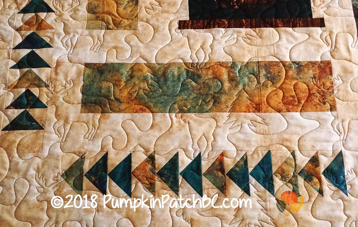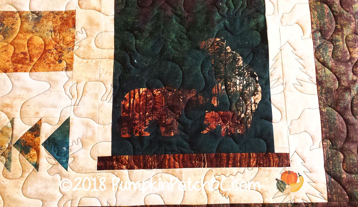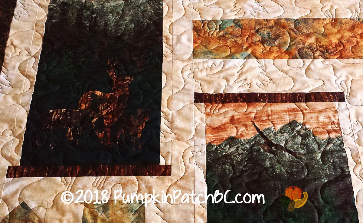 Aspen Ridge is the name of the fabric line by Northcott that Charlene used to make this beautiful autumn quilt. The “Deer in the Woods” pantograph was just perfect for this project, featuring elk, moose and bears, picking up the animal designs from the panels.