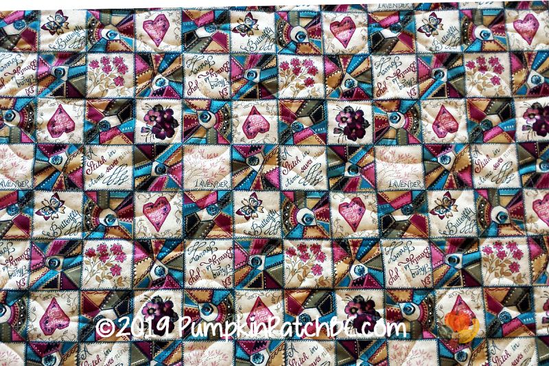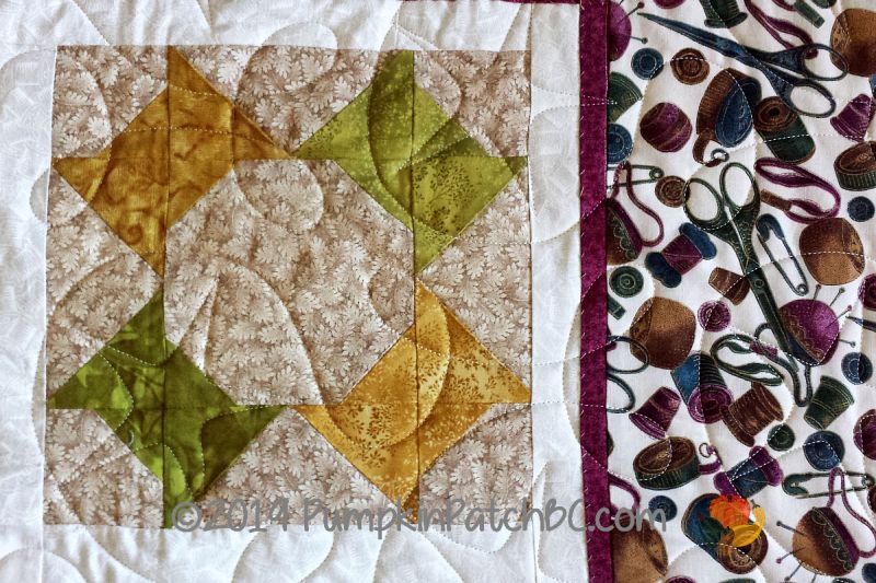 Cathy and her quilting friends in Alberta swapped the blocks in this quilt a few years ago, and Cathy decided it was time to finally finish this project before moving back to Alberta later this year. The pantograph I used is called “Ginger Star”, and Cathy even found a fabric in her stash that worked well for the backing.