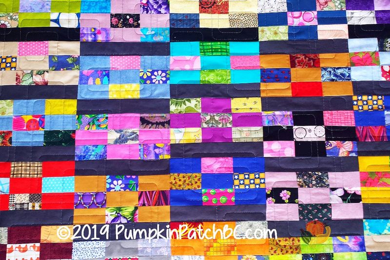 This fun scrappy project was pieced by Gail. What a neat idea to just make the nine patch blocks rectangular – simple but very effective. I also like how the black/grey strips between the blocks go from dark to light. We wondered if the quilt was too busy for anything other than meandering but it turned out that the modern design “Bauhaus” worked really well with the rectangular blocks.