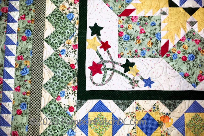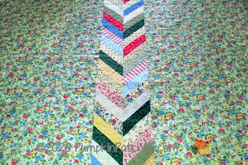 Pat started this gorgeous quilt years ago and worked on it on and off until she finished it last year. I have a vague memory of seeing this pattern in a Keepsake Quilting catalog a long time ago, when the internet was a long way from what it is today and they sent out little paper booklets every few months. I don’t remember the name of the pattern, “Always In Bloom” is the name of the Maywood Studio fabric line with the pretty roses. The quilting design is called “Rose Garden”, a perfect fit for Pat’s floral project.