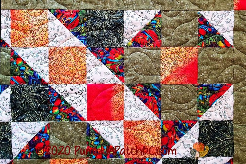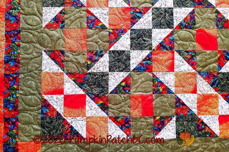 This colourful quilt was made by Sandra. Don’t you just love quilts with alternating blocks that create a secondary pattern? Sometimes you have to take a step back to be able to see it. I always enjoy when something unexpected shows up after all the blocks are put together. Sandra chose a leaf pattern for her quilt, this one is called “Wedding Vine”.