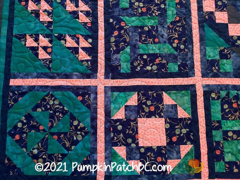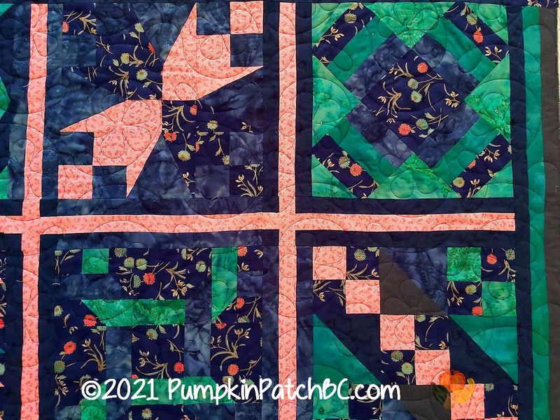 Another finished Block of the Month top from the Chilliwack Quilters Guild found its way to me, this one was made by Janet. Members were free to choose their colours which makes Janet’s quilt very different from Ellen’s. In fact, without knowing these two were part of the same group project I probably wouldn’t even have noticed. Janet has a pretty floral feature fabric, and we went with “Ginger Flower” as the quilting pattern.