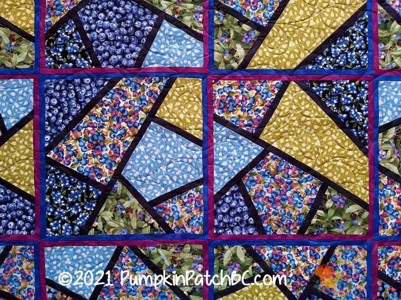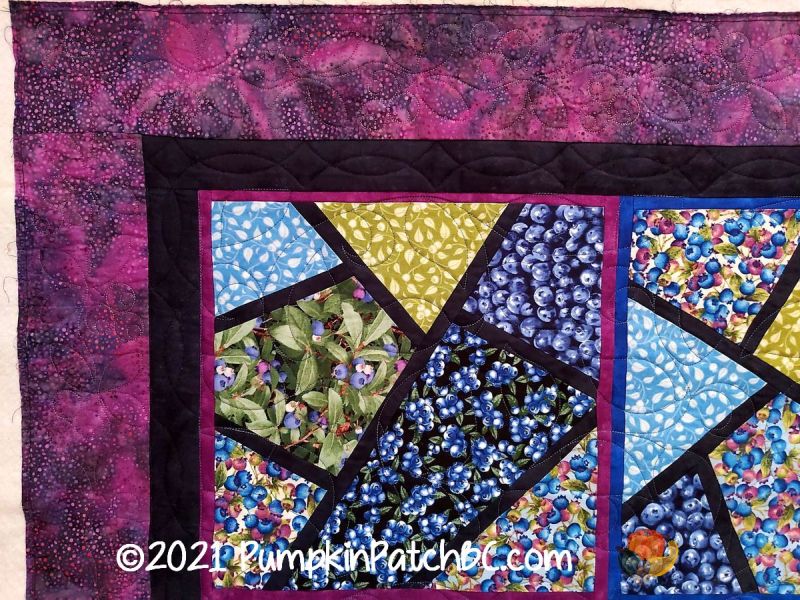 Susan made this blueberry themed quilt and asked if I could custom quilt it for her. This quilt is one of those rare ones where I think that custom quilting doesn’t make much sense. The fabrics and blocks are quite busy and the quilting gets lost, the irregular shapes in the blocks don’t really ask for specific custom patterns, and on top of it all this was a king size quilt, so custom quilting would be quite expensive without much of it showing in the end. We discussed a few ideas and then decided on a semi custom option with a pantograph in the block area but different designs for the two borders. I used “Wedding Vine” for the centre but couldn’t find a pattern that I liked for the outer border and finally designed my own blueberry vine to use on Susan’s quilt. We were both quite happy with the way it turned out.