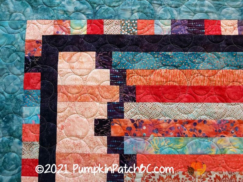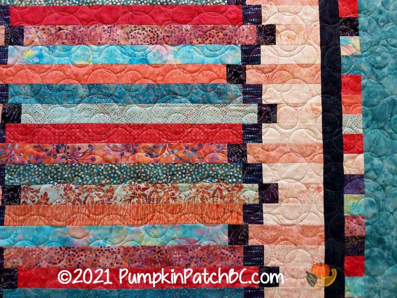 Isn’t this a neat pattern for Jelly Rolls? Kelley made this quilt using a free pattern she found online. It is by Jordan Fabrics, and you can easily find it using your favourite search engine. It also comes with a video tutorial on YouTube. I am a big fan of symmetry, and the structured layout really pleases my eye. And I love the colours Kelley chose, what a fabulous quilt. The pantograph I used is “Champagne Bubbles”. All those straight lines in the quilt top needed some curves to pull it all together.