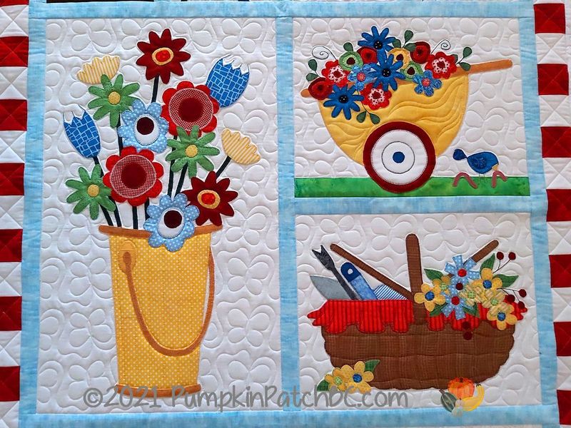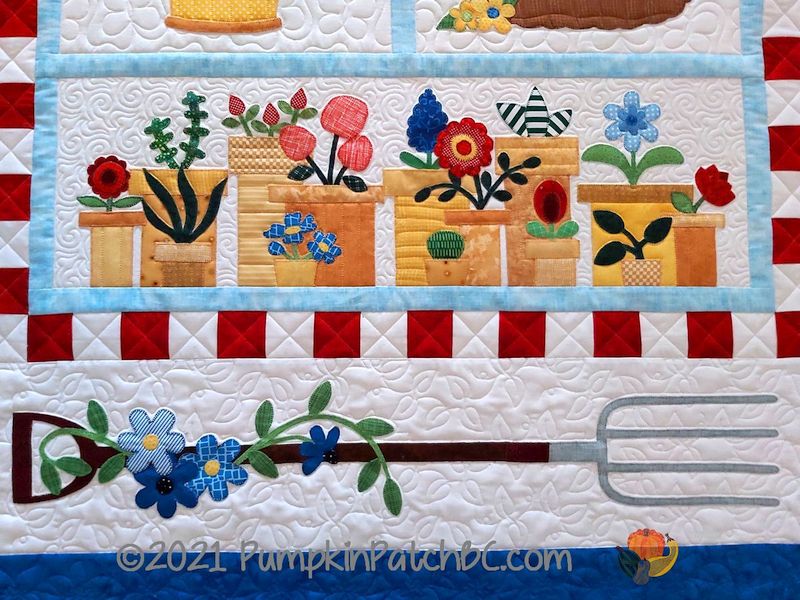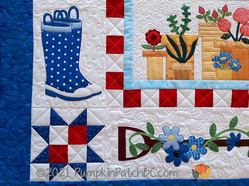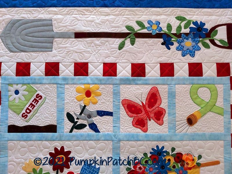 Isn’t this one of the cutest quilts ever? Brenda isn’t just a fantastic quilter, she also has a talent for finding the most charming patterns. This one is an Amy Bradley design, and there is so much going on! The birds and butterflies, the flowers and gardening tools, those adorable polka dot gumboots! I think you can tell how thrilled I was when I got to custom quilt this beauty. This is one of my favourite quilts ever. Be sure to click on the gallery pictures below for a better view.