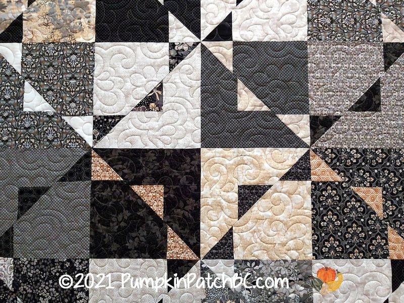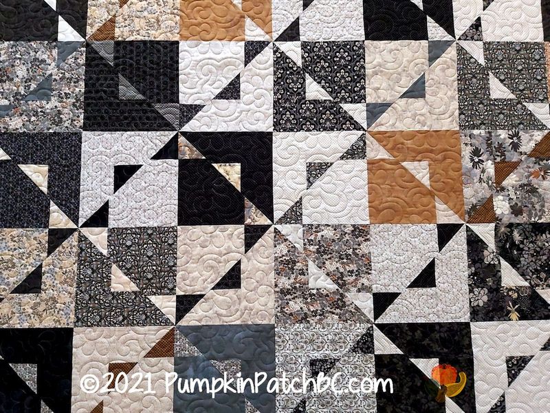 Wendy made this lovely quilt using the fabric line “Stiletto” by Basic Grey. This is another one of those quilts that I can look at for hours, and my brain will come up with several secondary designs. An elegant quilt that needed an elegant panto, and “Melange” was just the right choice for this one.