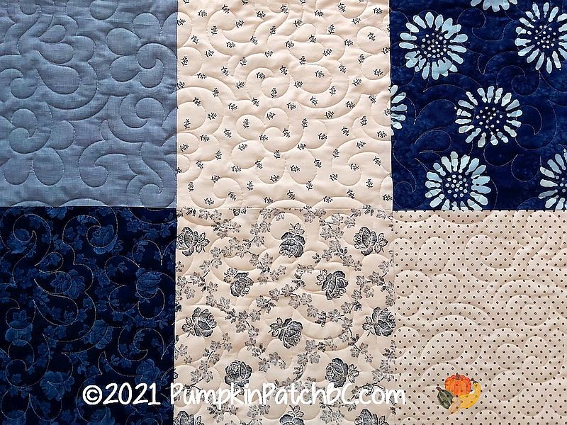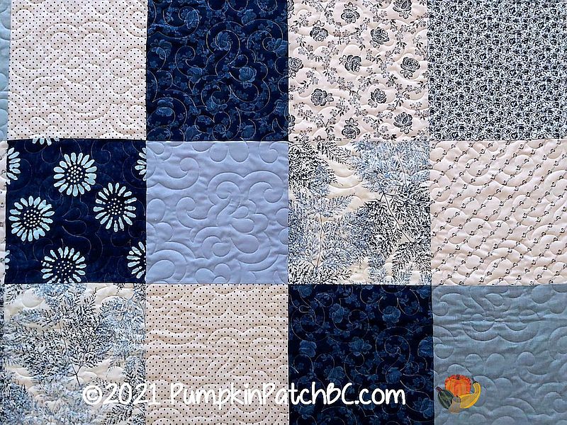 Another week, another chance, and I am feeling much calmer now, so back to our regularly scheduled program. I am way behind in posting pictures, all of these I am posting right now were actually quilted a year ago. This is the next of Sharon’s quilts. After her first one was such a success, she set out to make quilts for her family for Christmas and probably broke a record in speed sewing. For this lovely blue and white quilt she chose “Melange” as the quilting design.