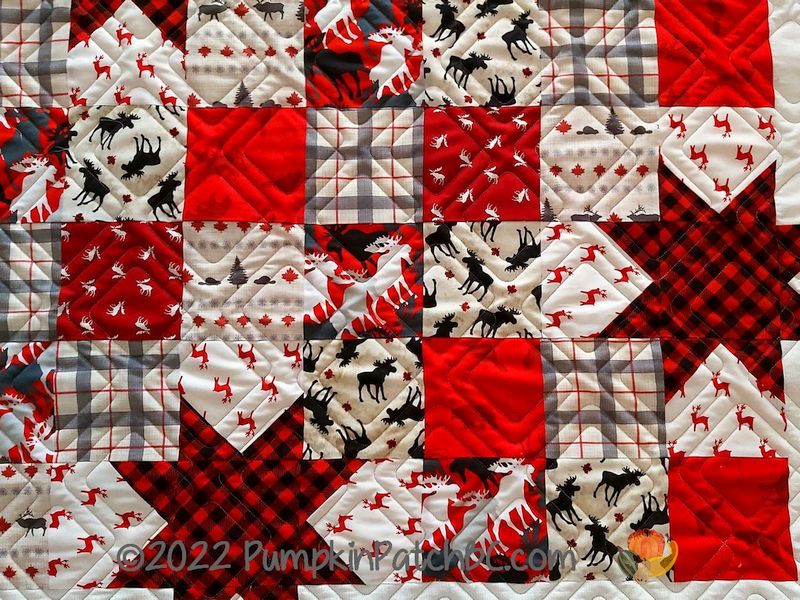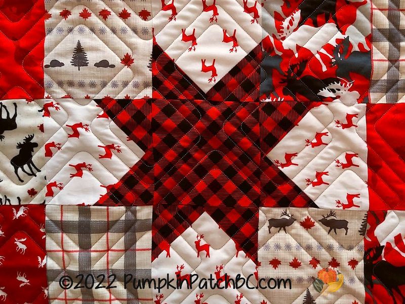 This very cozy and very Canadian quilt was made by Thomasine. It has moose and deer and maple leaves and also a few beavers here and there. The pantograph she chose is called “Diagonal Plaid Bias Cut”, and I think it is perfect for quilts with lots of squares and adds great texture.