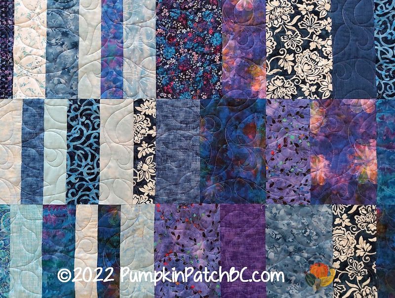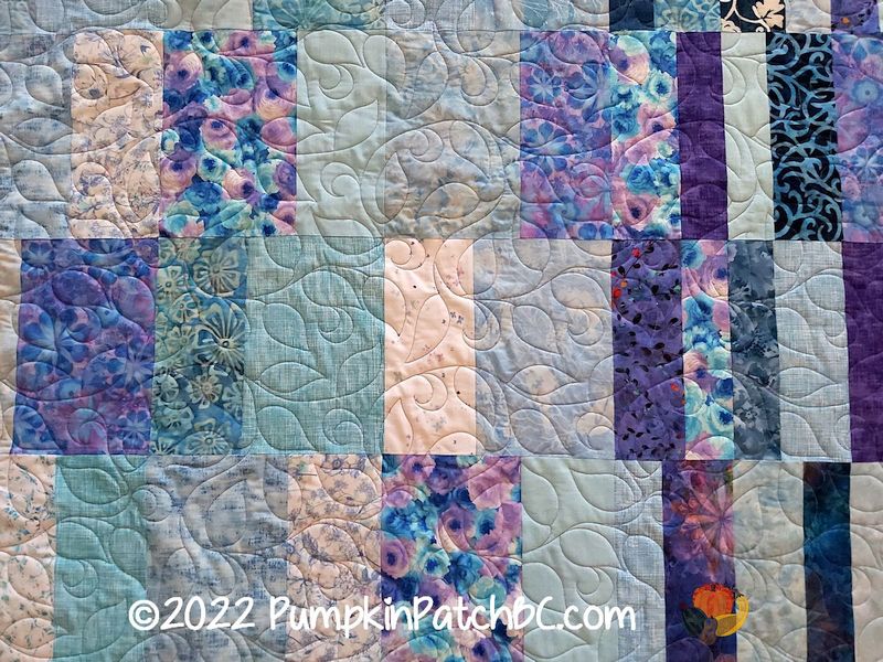 This lovely bluish-purple quilt was made by Mary. Isn’t it interesting how the dark and light colours merge in the centre for the overall effect? I love clever quilt designs like this. Mary requested a pattern with leaves and chose “Wedding Vine” for her project.