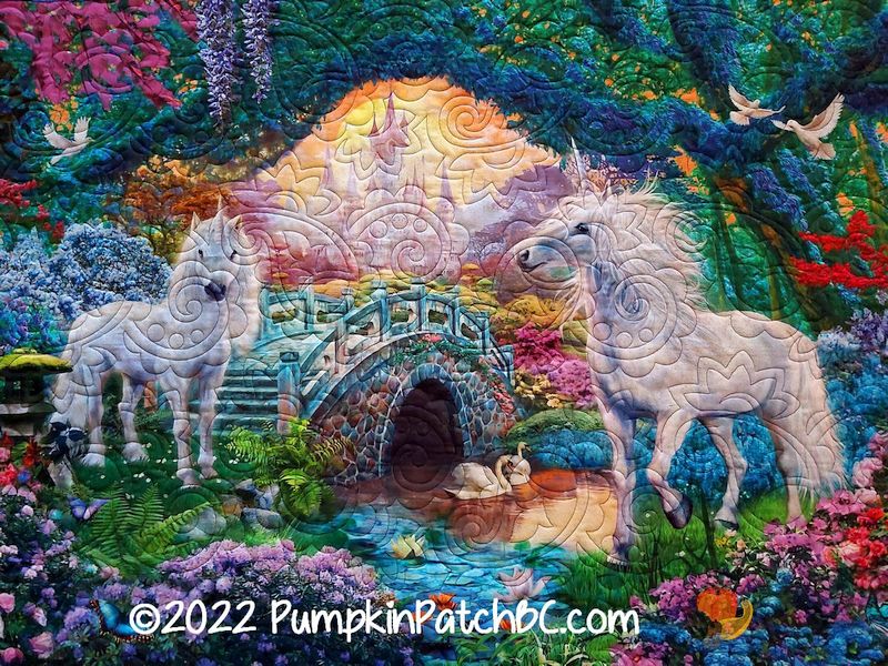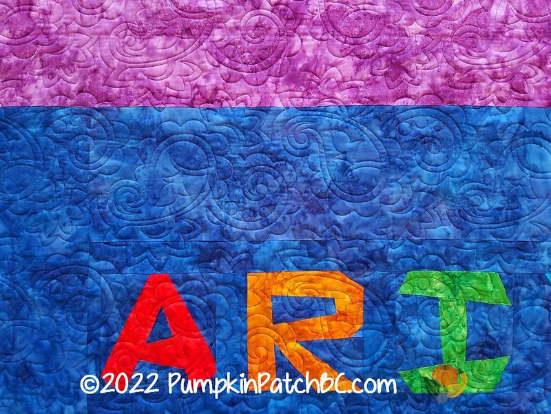 Penny made this quilt as a gift for her niece. She used a panel, added foundation-pieced letters to spell the girl’s name and several borders. There was a lot of negative space to fill for the wide inner borders, so a more intricated pantograph was called for, and we chose “New Delhi” which has a lot going on with paisley shapes, curls, pearls and a bit of echo quilting.