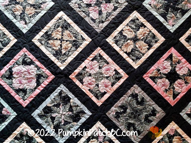 Stack-n-Whack is another great technique for those large scale prints that seem too precious to cut into tiny pieces. I personally have never tried it but I sure enjoy looking at the results. This rose quilt was made by Linda, and I like the on point setting and the frames around the blocks in different colours, they look great against the black background. The quilting pattern Linda chose is called “Ground Cover”.