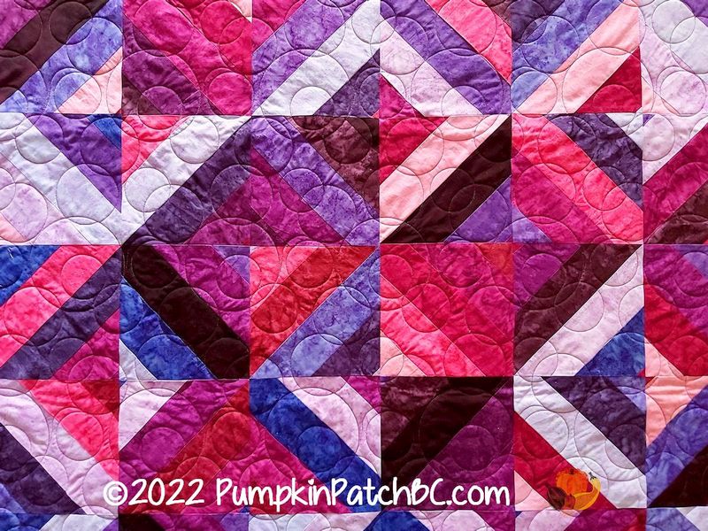 “Tea Time” is a great pattern for Jelly Rolls, and this quilt was made by Amanda. I was especially excited about all the pink and purple, of course, but it would look lovely in any colours. Amanda chose the pantograph “Champagne Bubbles” for her project, an excellent choice for all those straight seams and angles.