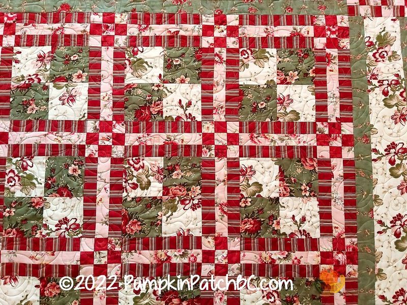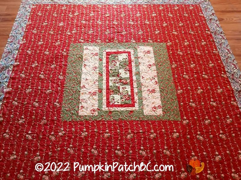 Pat made this quilt using a variety of rose fabrics. Her backings are usually a work of art too, she pieces them using leftover fabrics turning them into a second quilt top. It is pretty much impossible to center a quilt on a longarm machine in both directions because the backing is rolled up, and the top ends up where it ends up. Pat knows this and doesn’t care if it is perfectly centered or not. I quilted it with the pattern “Rose Garden”.