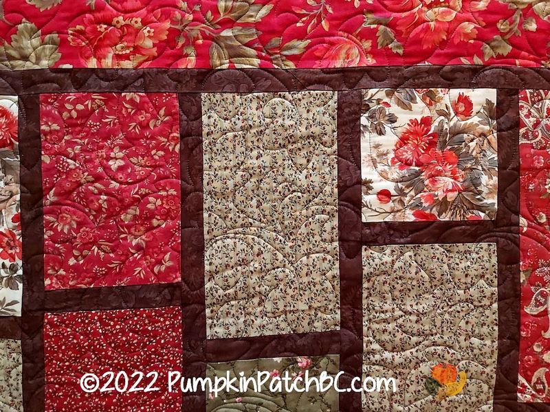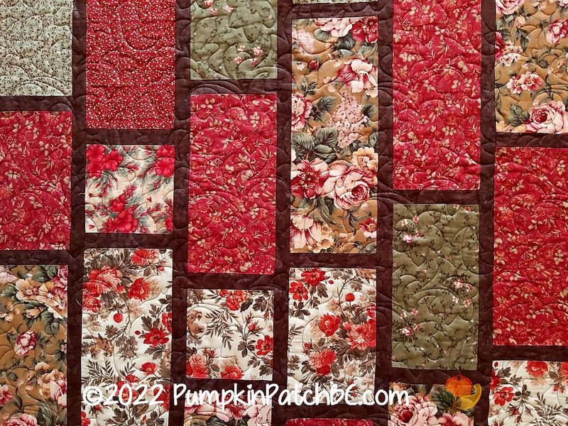 Here is another quilt made by Angela of Cozy Cottons Quilting. She had all these beautiful rose fabrics, almost too pretty to cut into pieces, and showcased them using this layout. I have a rose quilting pattern but we thought that would be too much, and Angela picked a leaf pattern called “Ground Cover” instead.