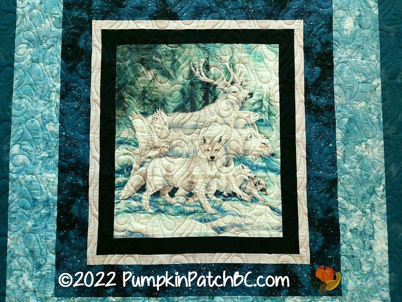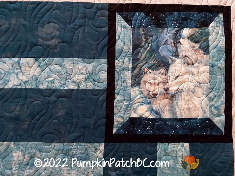 Karen bought the material for this quilt as a kit on a cruise to Alaska a few years back. Unfortunately the thread colour isn’t visible in the pictures, we chose a variegated black/blue/purple/teal thread and the pattern “Felicity” and decided it was representing the northern lights. It looks so much better in reality but this was the best I could do. What a great souvenir!