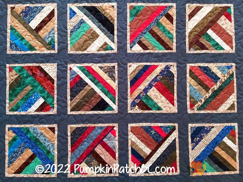 Carol is busy using up her scraps and ended up making not just one but two of these scrap quilts. I like how she framed the blocks and put sashing in between, it organizes the “chaos” of all the different fabrics and draws attention to the individual blocks. Lots of quilting designs work with scrappy quilts, and Carol chose “Ground Cover”, a leaf pattern, for the first quilt and “Ginger Flower” for the second.