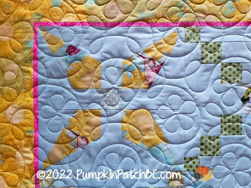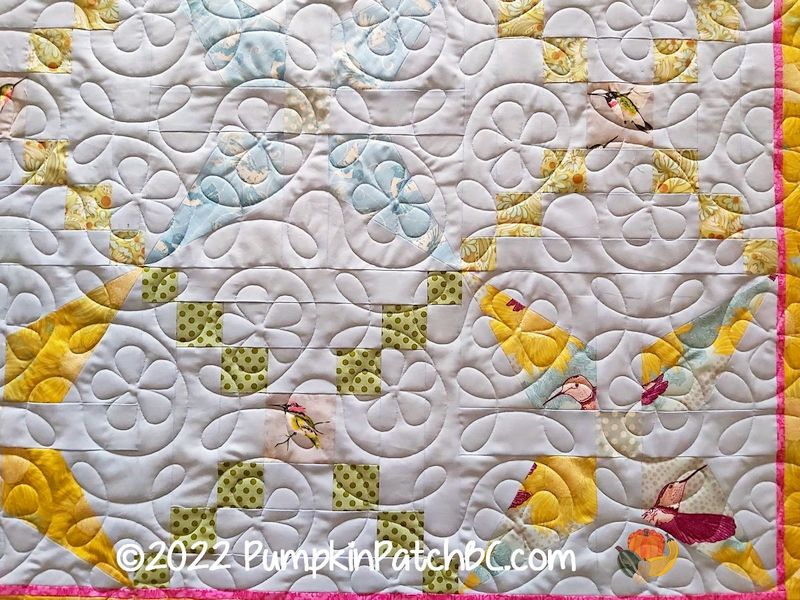 “Hummingbirds” is a lovely quilt in soft colours made by Bonnie. She chose the design “Ginger Flower” to finish her project. Once again I would like to point out that the quilting is not as visible in reality as it seems in the pictures. It does not take away from the quilt itself, there are some tricks to make it more visible in pictures.