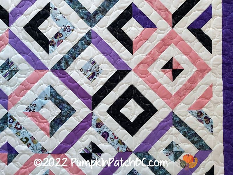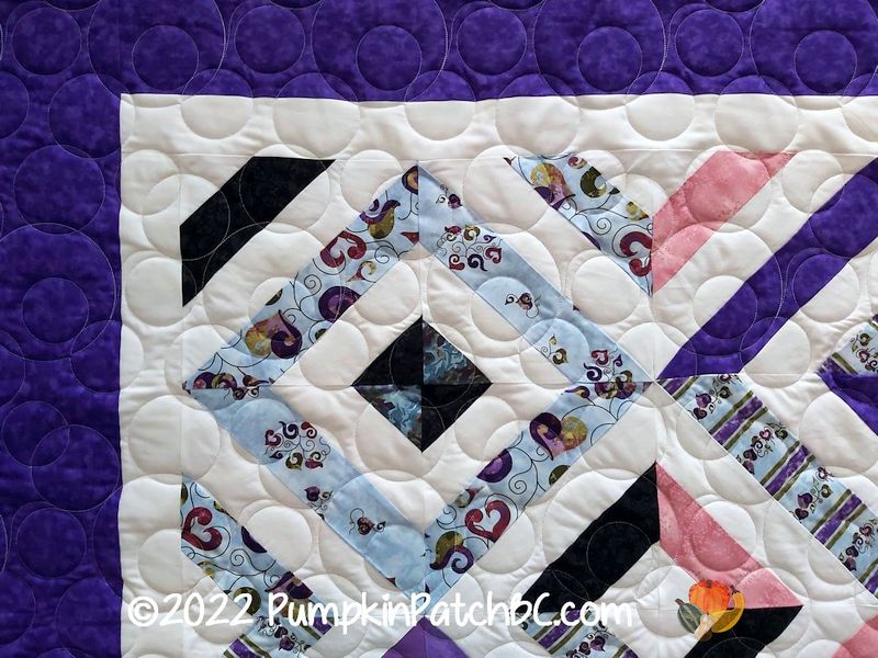 This quilt in purple and pink was made by Lillian. What an excellent design for Jelly Rolls! Lillian liked the modern look of “Champagne Bubbles”, and all those quilted circles work nicely with the straight lines of the pieced top.
