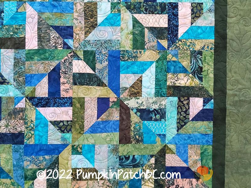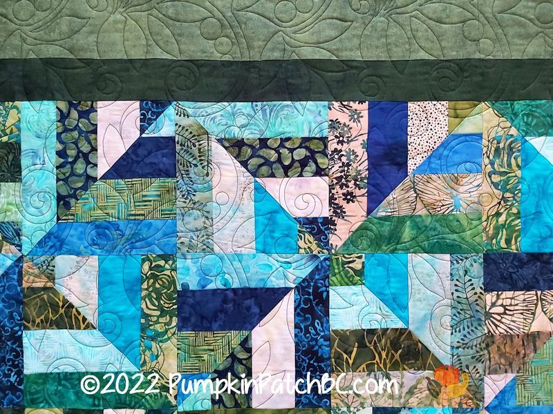 Here is another quilt suitable for Jelly Rolls, this one was made by Denise. Aren’t the colours just lovely? And if you take a step back and/or squint, the layout seems to become almost three-dimensional, with half of the blocks floating above the others in a gentle wave. Or maybe that’s just the way my weird brain works but I absolutely love it. The batiks Denise used have floral and leaf patterns, and since green is the dominant colour in her quilt, we chose the leafy design “Jasper” to finish her project.