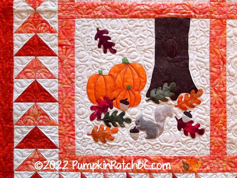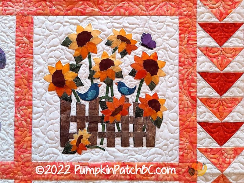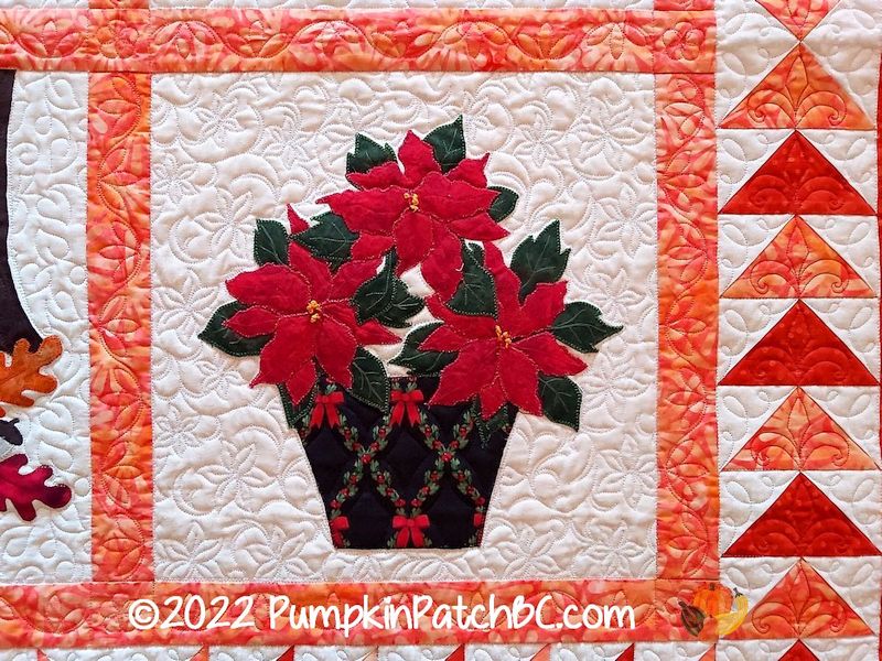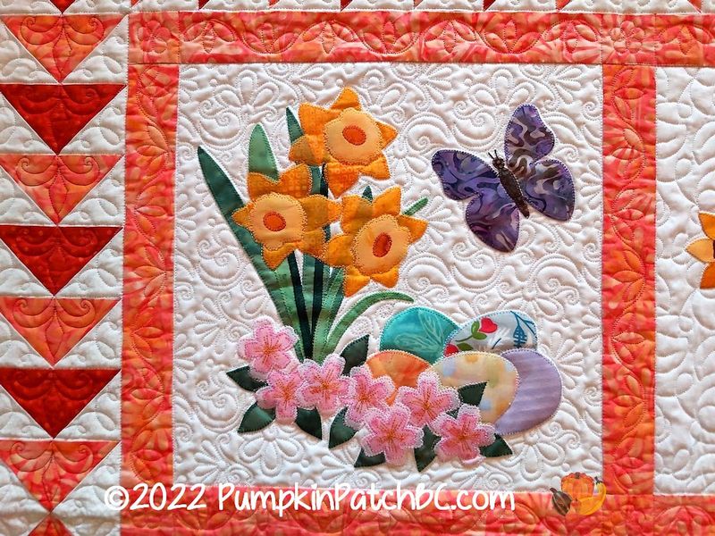 I just realized that I never posted pictures of my Covid Round Robin project. We started it in the fall of 2020 with the guild, to keep us occupied during the first winter of Covid when we couldn’t have any guild meetings. Four people formed a group, and there were basically no rules, each group could do whatever they wanted. Most did a real Round Robin, one group did a Row Robin and my group decided to just do a Block Robin. I picked the four seasons as my theme and made a spring block with flowers, Easter eggs and a butterfly. Connie was next and chose to make a poinsettia for the winter block. Evelyn’s block is an amazing summer garden scene with birds and sunflowers and another butterfly. Kim had to take what was left and created an autumn scene with pumpkins and a squirrel.