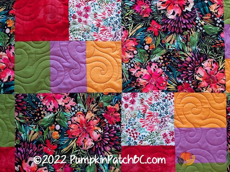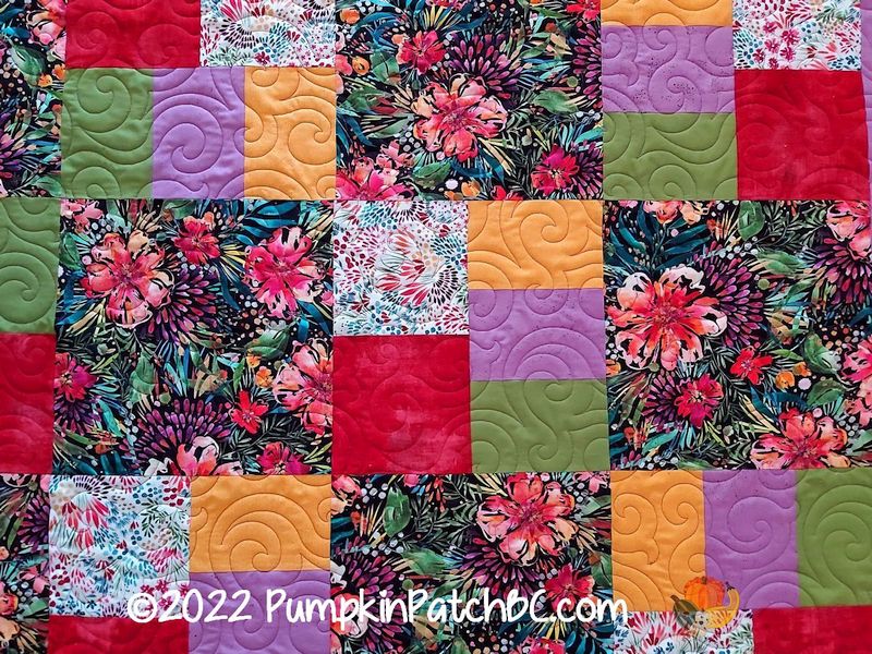Mary made this quilt showcasing beautiful large floral prints. I love the bold, bright colours! We decided that the quilt didn’t need an elaborate quilting pattern and chose “Whisper” a basic swirly design.
