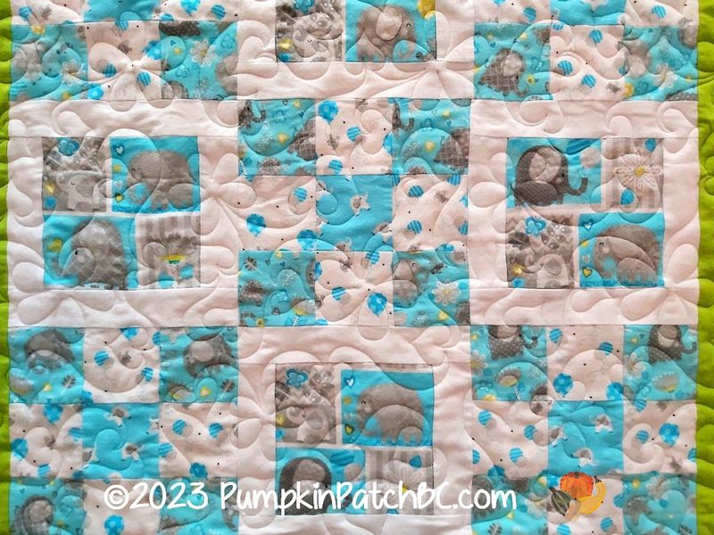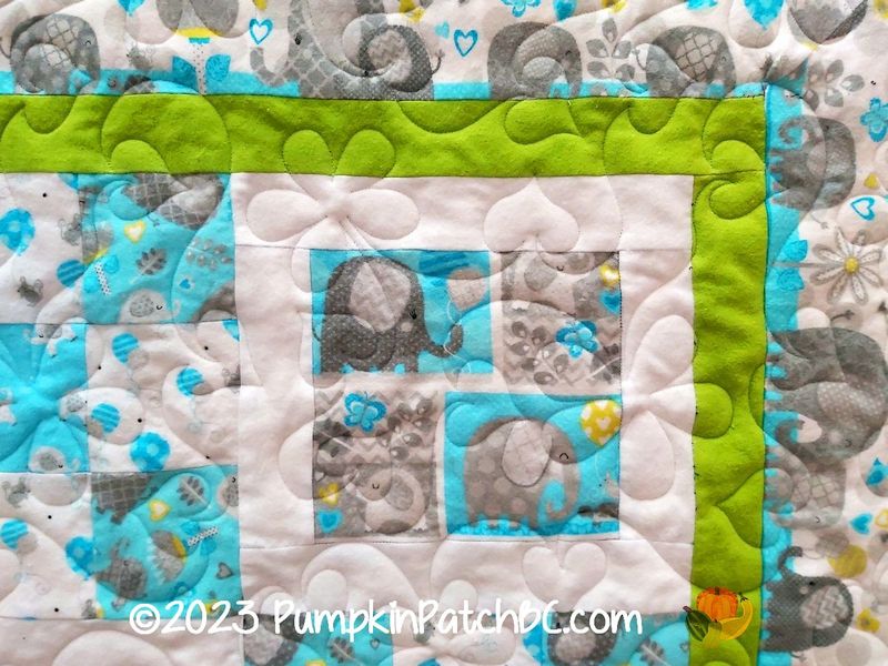 Thomasine also made this adorable little baby quilt with elephants. I quilted it with the design “Wandering Daisies” that has just the right amount of playfulness for the quilt. What a cute gift!
