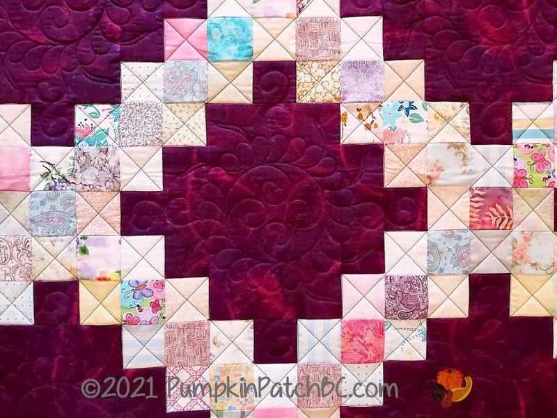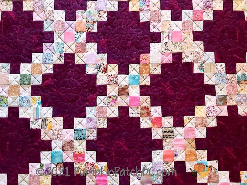 This Double Irish Chain quilt was a guild project a while back, and Ellen asked me to custom quilt her version. She gave me a drawing of the feather wreath she wanted in the alternate blocks, and I filled the chain parts with diagonal lines. We were both quite happy with the way it turned out.