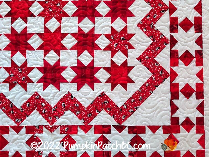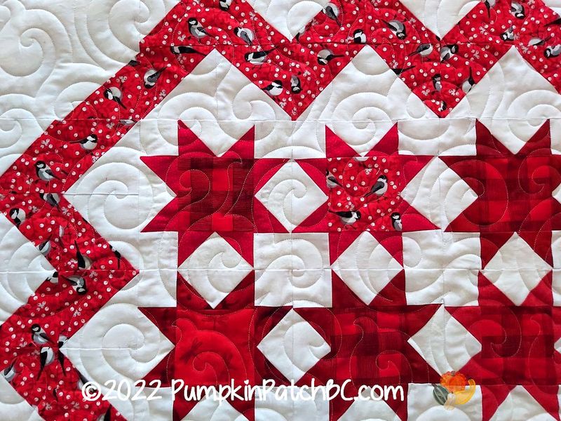 Red and white is such a striking combination, and I really like how Paige used these colours in her quilt, especially the positive/negative effect with the red stars in the centre and the white stars in the border. Just lovely. We chose the pattern “Whisper” for quilting, a basic swirly pattern that complements the straight lines and sharp angles of the pieced top.