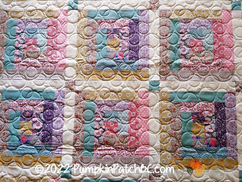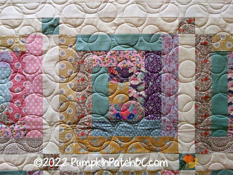 Here is another quilt I quilted with the circle pattern “Champagne Bubbles”. Curves, swirls and circles work really well for geometric quilt patterns with lots of straight lines and sharp angles. This one was made by Maureen in a rainbow of colours.