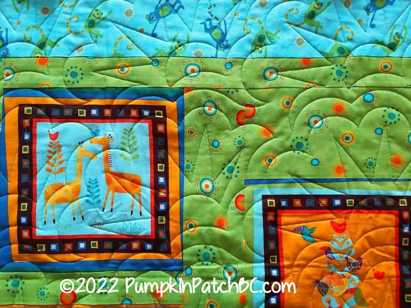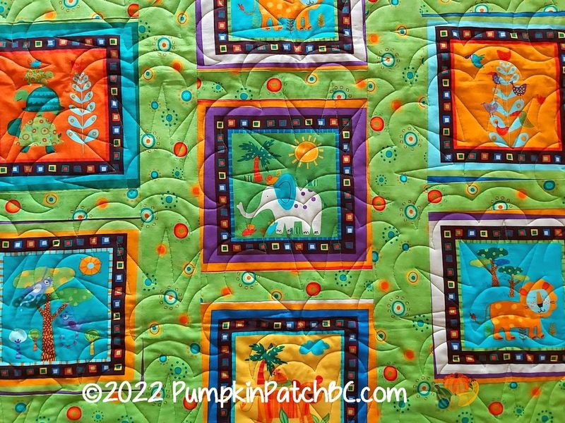 This cute quilt was also made by Maureen. Aren’t the animal panels just adorable? I quilted it with a pattern called “Sun Scallops”, just right for a summer safari.