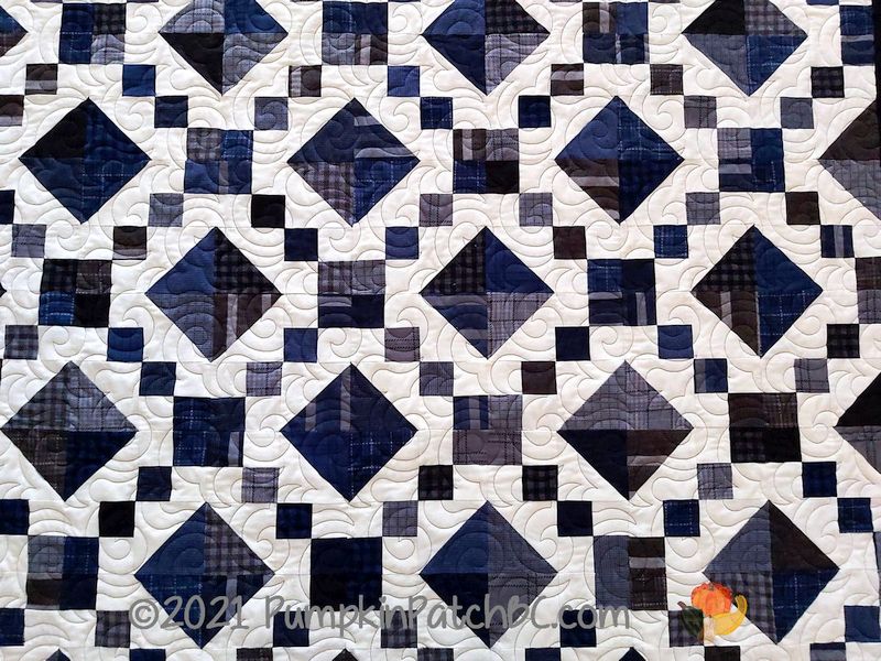 This is another one of Wendy’s quilts, this one features the pattern “Jewel Box”. Doesn’t it look cozy in those blue checks and plaids? Jewel Box quilts are often quite colourful, but this monochromatic approach really speaks to me. The pattern doesn’t need much in terms of quilting, and a basic scroll pattern like “Wild Wind” works really well.