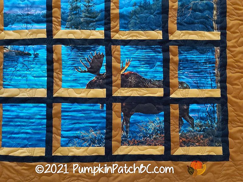 Kathy made this Moose quilt as a gift for a friend. Have you ever wondered what to do with a panel, how to make it more interesting without losing the overall image? By cutting up the moose panel into squares and then putting the squares back together as attic window blocks Kathy created a wonderful illusion of scenery outside a window. “Deer in the Woods” which has not only deer but also a bear and a moose and trees was the perfect quilting design for Kathy’s quilt.