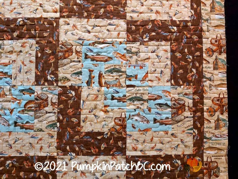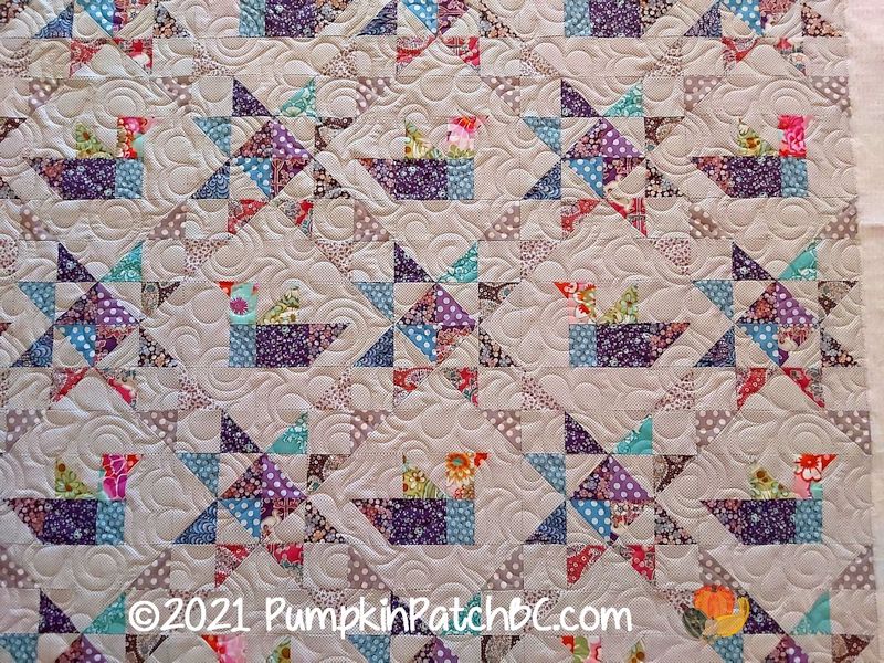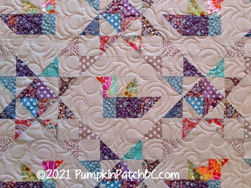 I came up with some kind of layout, very simple, really, probably too simple, because I ended up sewing the rows together in the wrong order and spent some time taking it all apart again. When the top was finished I decided to just use a pantograph for quilting and chose “White Out”, a snowflake pattern that I have in my collection. And for the first time ever I ran out of backing fabric on my longarm frame. I could have kicked myself… remember that old saying about measuring twice before cutting? Well, the same goes for measuring before loading a quilt, and while I would never, ever not measure a customer’s quilt, I *thought* I knew how large my quilt top was.