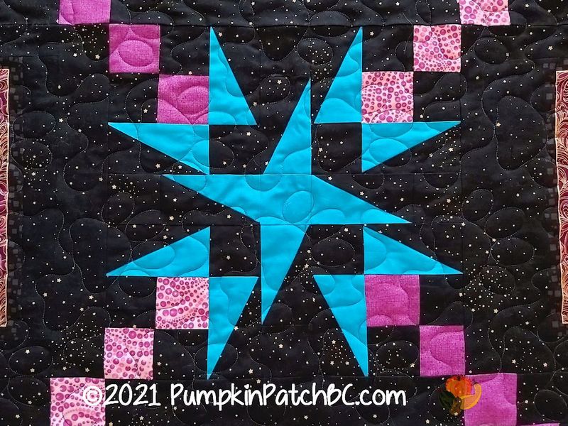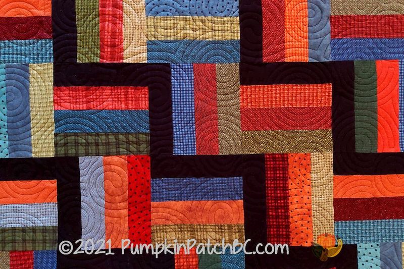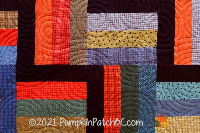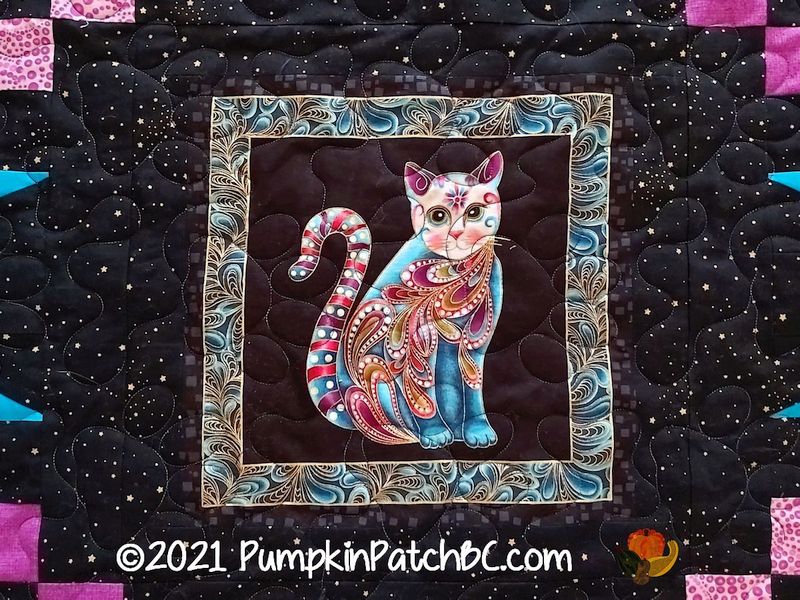 “Cat-I-Tude” is the name of the fabric line by Ann Lauer for Benartex that Sherri used to make this quilt. (There is also a similar line for dog lovers called “Dog On It”). The cat blocks are a panel, Sherri cut them apart and put them into a chain setting with star blocks. Isn’t it great how the black background makes the colours pop? It was quilted with paw prints, the name of the pantograph is “Puppy Paws” but they sure look like “Kitty Paws” to me 😉