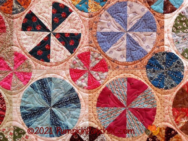 Cynthia likes to do handwork, and she made this fabulous Pies & Tarts quilt (pattern by Sue Daley). She asked for light custom quilting, and this is the result. It’s a lovely quilt and a great scrapbuster for those who enjoy English Paper Piecing.