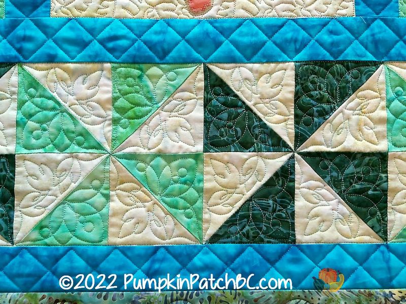 I wanted to incorporate the major elements of the quilt when I drafted the pillow design and put the colourful Flying Geese into the border. The hearts were separated and form the cornerstones.
