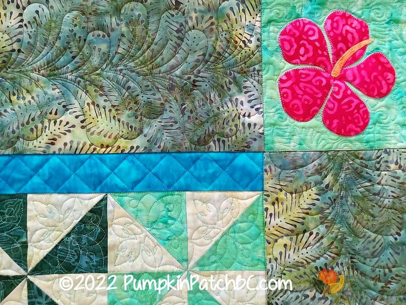 After finishing the Monkey Business BOM I thought I should turn the monkey into a quilt that doesn’t feature human behaviour and is less complicated than the BOM quilt. So I took the first block with the monkey swinging on a vine with a banana and put together a completely different quilt with vibrant hibiscus flowers in the alternating blocks. And since I made the monkey pillow in fabrics matching the original Monkey Business quilt, I tried to make a second one with Jungle Monkeys colours but wasn’t really happy with the outcome. I guess I was bored by doing the same thing again, so instead I took the hibiscus block and turned it into a colourful pillow.