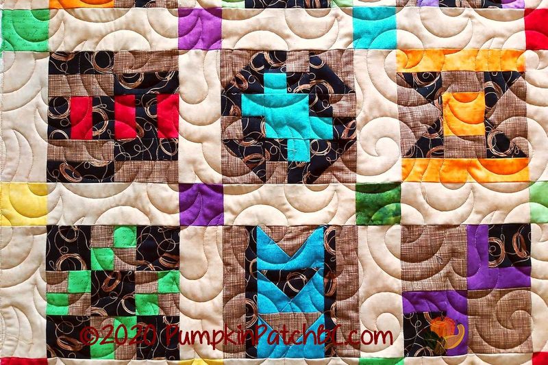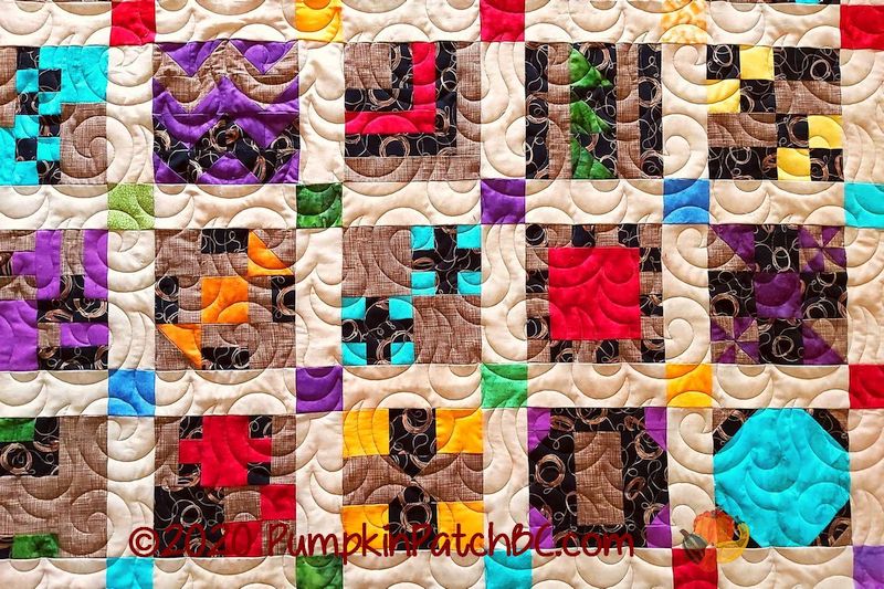 In 2019, the Canadian Quilters Association started a sew along with the theme “52 blocks in 52 weeks”. They posted a 6″ block every week, and quilters from all over the world made them and shared pictures of their projects. Several of my local guild members joined the challenge as well, and this is Ellen’s version of the CQA Challenge Quilt. I love the bright colours she used to accent the blocks and how well the background fabrics pull the design together. Ellen chose “Wild Wind”, a basic swirly panto, for her project.