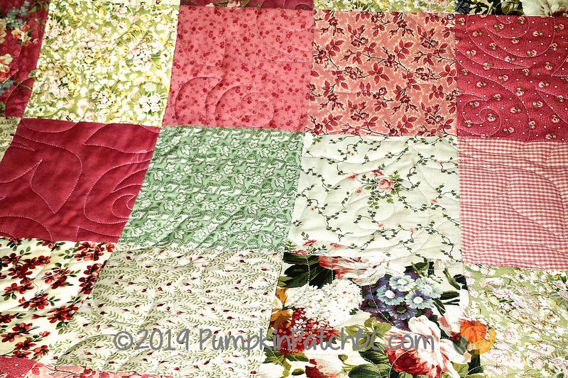 This romantic rose quilt was the third project Carla brought to me for quilting. The top has been around for a while, she thinks at least ten years, waiting for a border to be added. Carla felt that a border wasn’t going to happen anytime soon and decided that finished was better than perfect and the quilt was just fine without a border. Choosing a quilting design was easy, we went with the rose theme, and I used the pantograph “Rose Garden”.