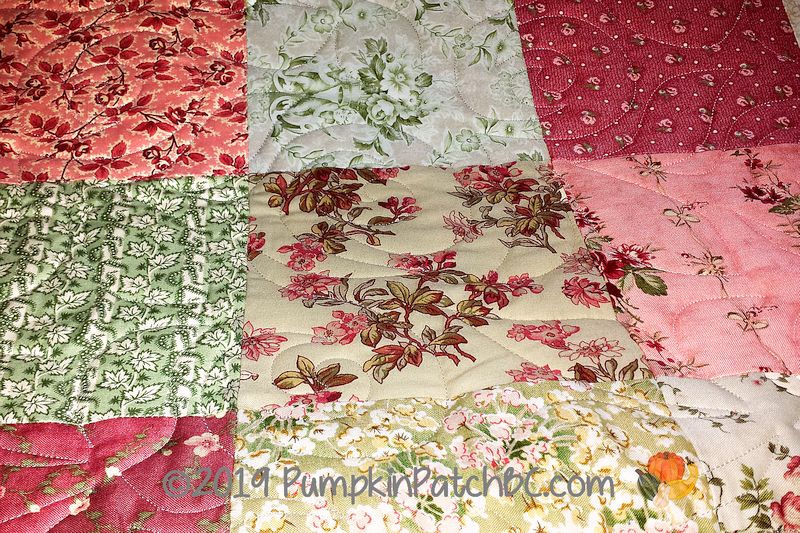Carla made this quilt top a very long time ago, she thinks probably 25 years. Her original plan was to add appliquéd hearts to the alternate blocks but life got in the way and she decided the quilt was just fine without the hearts. The quilting design is called “Azaleas” and fills the negative space nicely. I am experimenting with taking the pictures in a different spot, with the quilt draped on the frame but I am not sure yet if I like it. I was hoping to get the colours to look better but haven’t had much success. The pink fabric looks too much like bubble gum in the photos, it is a very nice and soft pink in reality. I’ll keep trying!