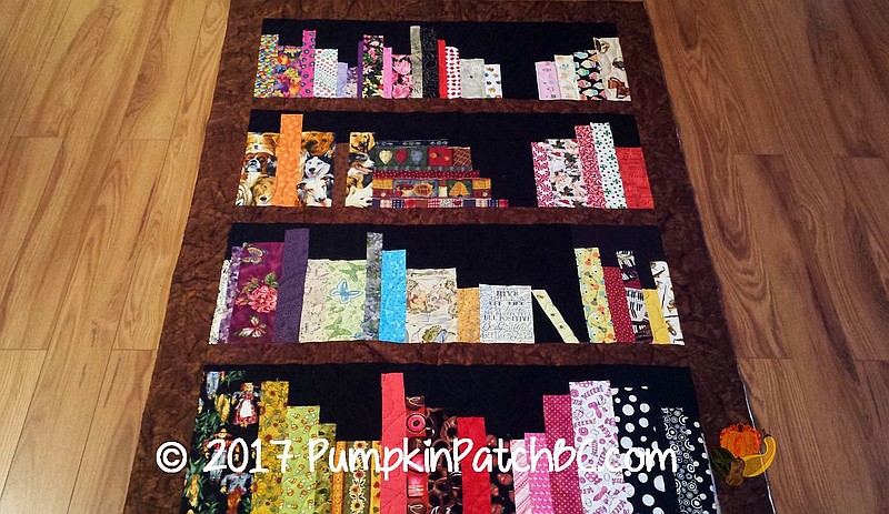 Crazy Cats is a Buggy Barn pattern and was made by Sharon. She wanted the cats to stand out and had even added an extra layer of batting to make them puffy, so I stayed away from them as much as possible during quilting. I chose four different background fillers and alternated them around the blocks. One of the fillers was a swirly design that I picked up for the outer border. Sharon put a lot of love and work into this top. All the eyes are buttons, different ones for every cat to suit their personality. Some of the whiskers are embroidered, some of them are rick rack or leather. The back didn’t photograph well, the colour looked beige in the pictures but is an orange-brown in reality that goes well with the colour scheme of the top. I fiddled around with it in photo editing software, and this is as good as it gets but it is much too bright and orange in the picture.